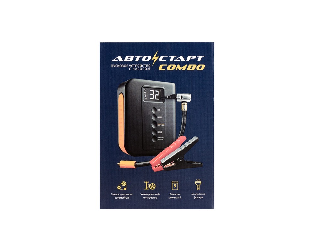 Автостарт Combo – это сразу два устройства в одном компактном корпусе! Гаджет за секунды запустит бензиновый или дизельный двигатели при севшем автомобильном аккумуляторе. Пусковой/пиковый ток составляет 500 А / 800 А.