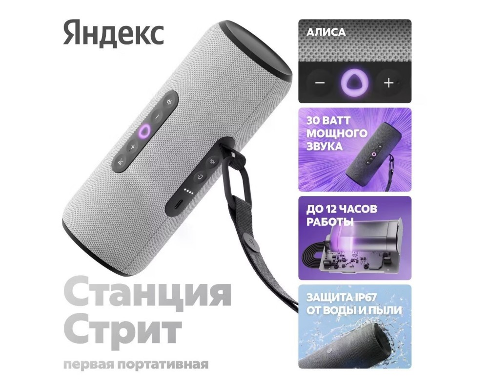 Яндекс Станция Стрит — первая портативная умная колонка Яндекса с мощным звучанием, AI-ассистентом Алисой и ёмким аккумулятором. Берите устройство с собой, куда бы ни отправились, и управляйте любимой музыкой голосом по Wi-Fi (Wi-Fi и логотип Wi-Fi являются товарными знаками Wi-Fi Alliance) и Bluetooth (Bluetooth являются зарегистрированными товарными знаками корпорации Bluetooth SIG, Inc.).