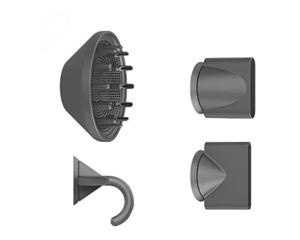 Модель имеет конструкцию как у популярного фена от Dyson, при этом стоит гораздо дешевле. Фен выглядит стильно и доступен к покупке в четырех цветовых вариантах: сером, серебристом, синем и розовом.