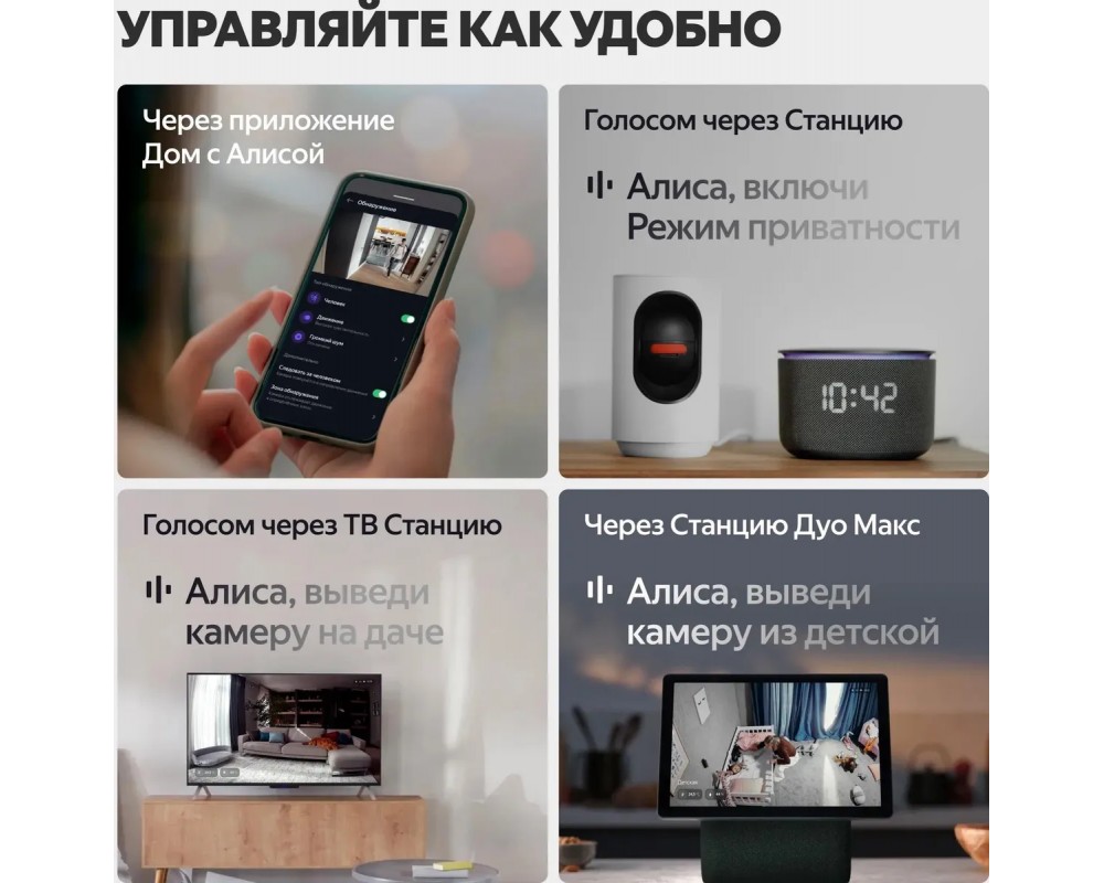 Поддержка системы «Умный дом с Алисой» позволяет получать уведомления о движении, подключать устройство к другим сценариям умного дома и управлять через мобильное приложение. Видеоархив сохраняется в облако или на карту памяти, а встроенный микрофон передаёт звук в режиме реального времени.